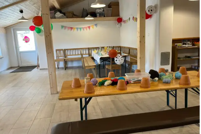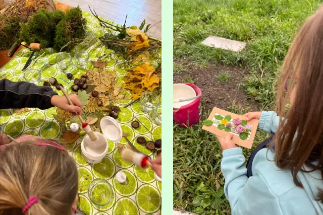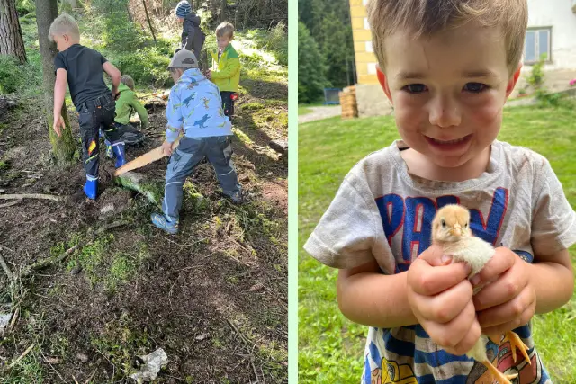 Kerstin liebt die Waldpädagogik. Sie sammelt mit den Kindern Naturmaterialien, lässt sie gestalten, entdecken und genau hinschauen. Der Wald wird zum Lernraum. Der Hof zum Erlebnisort.