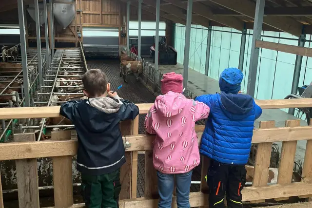 Empfangen werden die Gruppen von Erlebnisbäuerin Kerstin auf der Plattform im Kuhstall. Von oben haben die Kinder einen wunderbaren Überblick über die Milchkühe – und staunen, wie entspannt Kühe am liebsten einfach liegen und wiederkäuen.